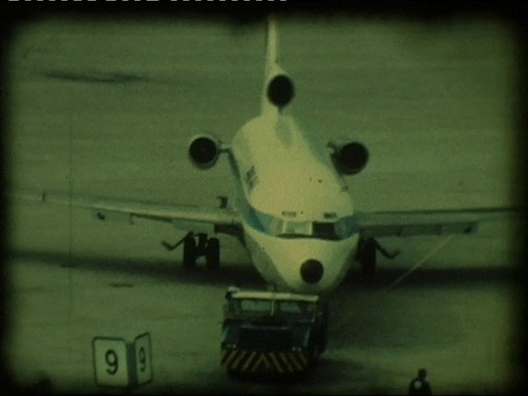 AIRBRIDGE (D 1979) ca. 17 min, Stummfilm, Farbe Der Film diente als Übungsfilm. Der Hauptakteur bekommt Besuch, der rund eine Stunde vor Ankunft anruft. Danach wird immer wieder zwischen zwei Handlungen umgeschaltet. Während der Hauptakteur die Wohnung putzt und sich schön macht reist der Besucher vom Flughafen zu ihm. Zum Schluß das Gegenteil. Der Hauptakteur liest, immer wieder unterbrochen von Szenen der Rückreise, der Flugzeugcheck und der Abflug. - Es ist auch der einzige Doppelgängerfilm. Der Besucher und der Hauptakteur werden von der gleichen Person gespielt.